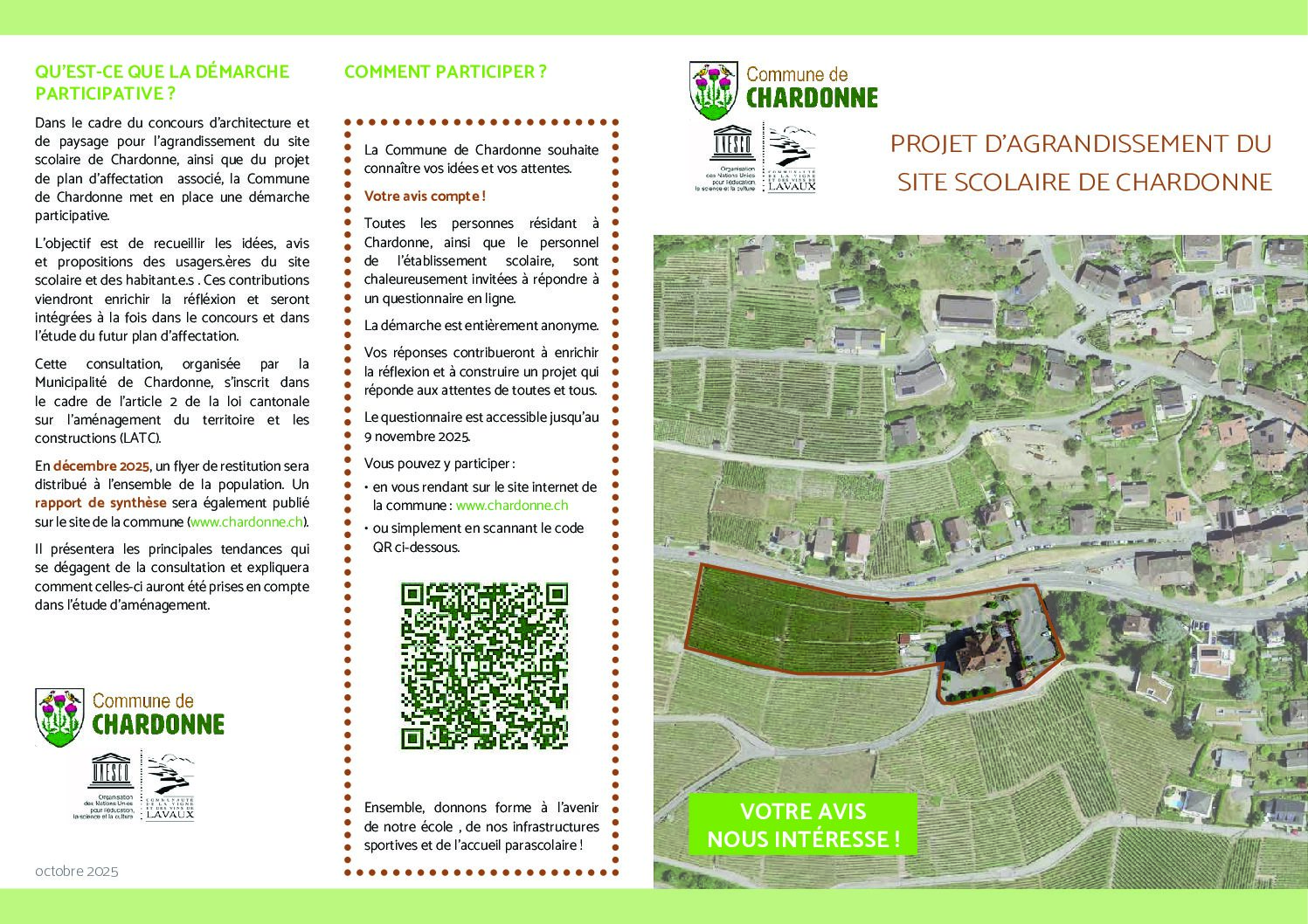 BIENVENUE SUR LE SITE DE CHARDONNE ? Pilier public Retrouvez l’ensemble des nouvelles et informations publiées. Société de développement de Chardonne – Mt-Pèlerin (“Le DEV”) Activités locales, vie culturelle, événements Tourisme & loisirs Découvrez le Lavaux inscrit au patrimoine mondial de l’UNESCO. Guichet virtuel Les services administratifs en ligne Politique de confidentialité A qui s’adresser Toutes les coordonnées des services utiles à la vie locale Votations Votations communales : ouverture de 10h à 11h le dimanche, jour du scrutin. ? Projet d’agrandissement du site scolaire de Chardonne Projet d’agrandissement du site scolaire de Chardonne En savoir plus Les Agences d’assurances sociales (AAS) de la Riviera sont là pour vous Les Agences d’assurances sociales (AAS) de la Riviera sont là pour vous En savoir plus Décision du Conseil intercommunal de l’ASICC du 24 septembre 2025 Décisions du Conseil intercommunal de l’ASICC du 24 septembre 2025 En savoir plus Ensemble, dessinons notre territoire de demain Ensemble, dessinons notre territoire de demain En savoir plus